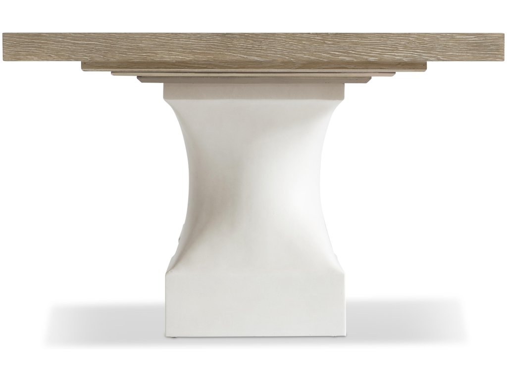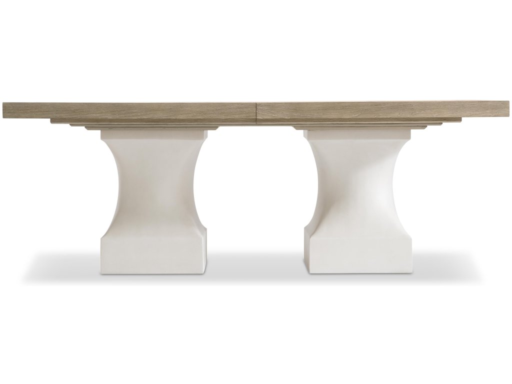 Product Description: Sleek sculptural forms elevate the simple lines of the Aventura dining table. The table pedestals are formed with concave cast resin over a square base in our Tusk finish. The wood top, which includes two 20-inch leaves, offers a stunning contrast in the warm Marcona finish.