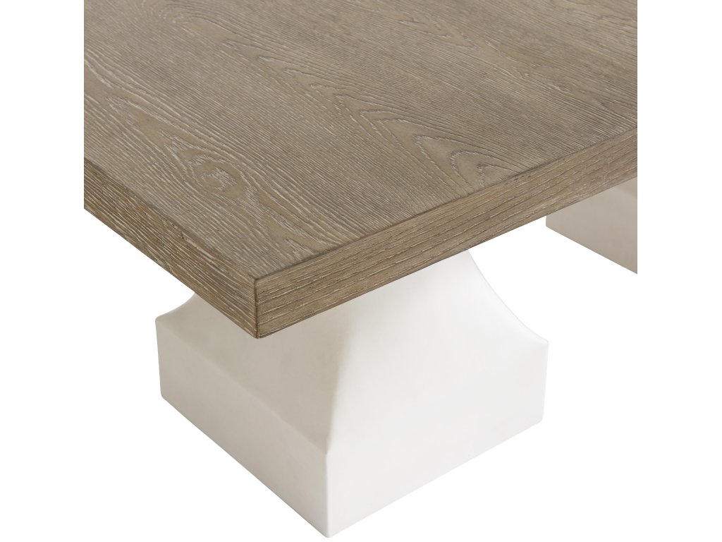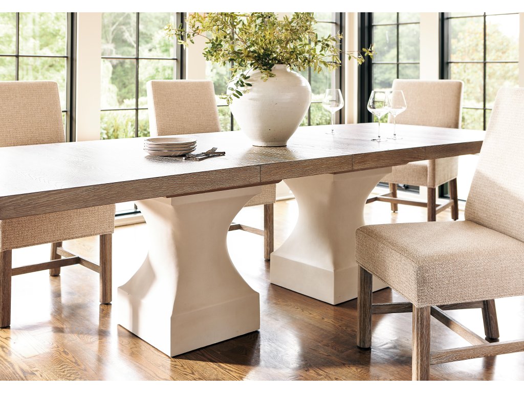 Features: Top: Cathedral-cut white oak solids & veneers in Marcona finishTwo 20" leavesBase: Two square cast resin pedestals in Tusk faux stone finishDimensions listed are per pedestal baseAdjustable glidesSpecifications subject to change without notice Finish: Tusk Finish, Marcona Finish